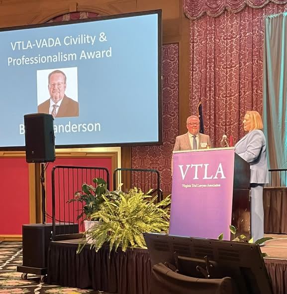 Congratulations to VADA member Brian Sanderson, recipient of the Virginia Trial Lawyers Association’s 2026 VTLA-VADA Civility and Professionalism Award! VTLA presented the Award to Brian this past week at the VTLA’s Annual Convention. Congratulations, Brian!